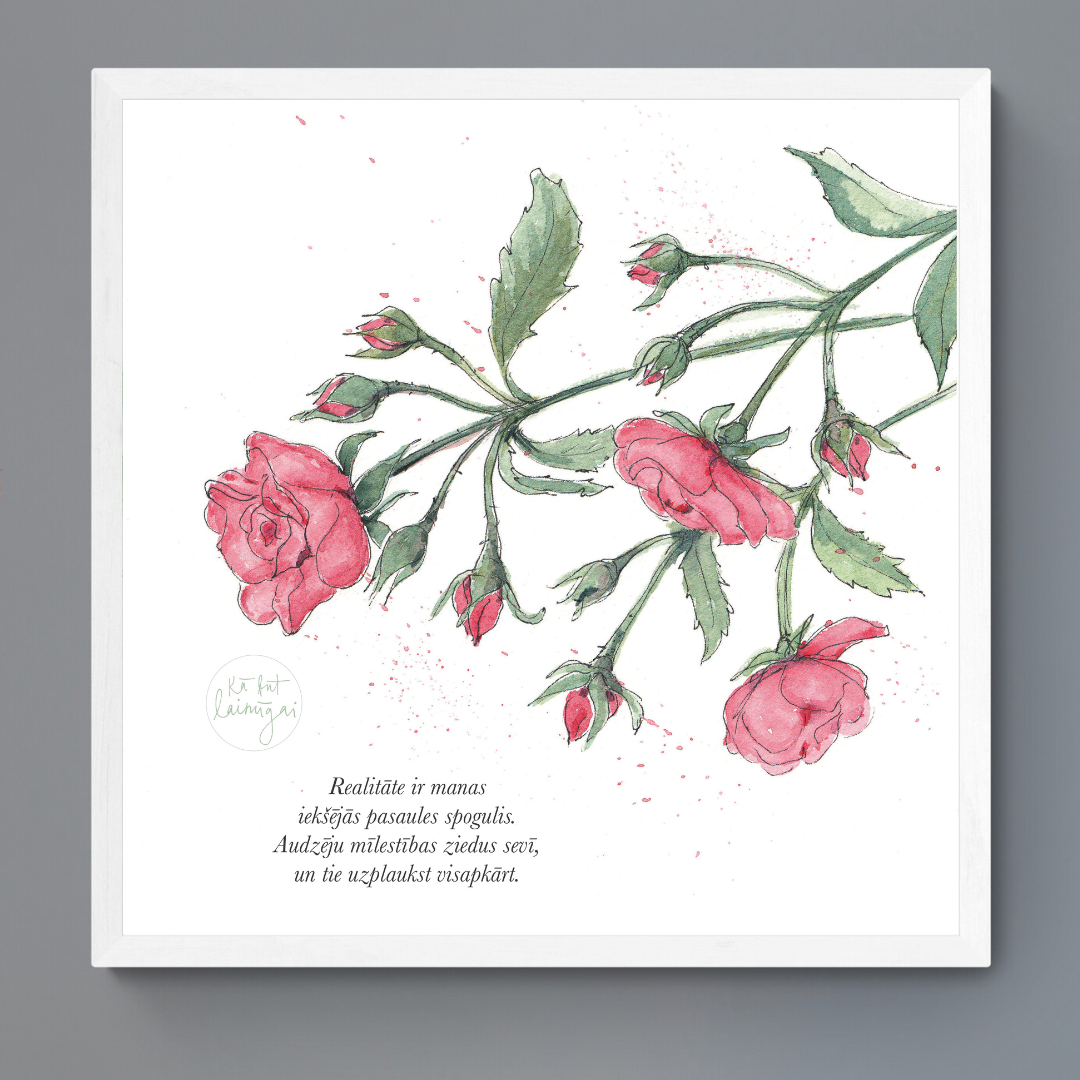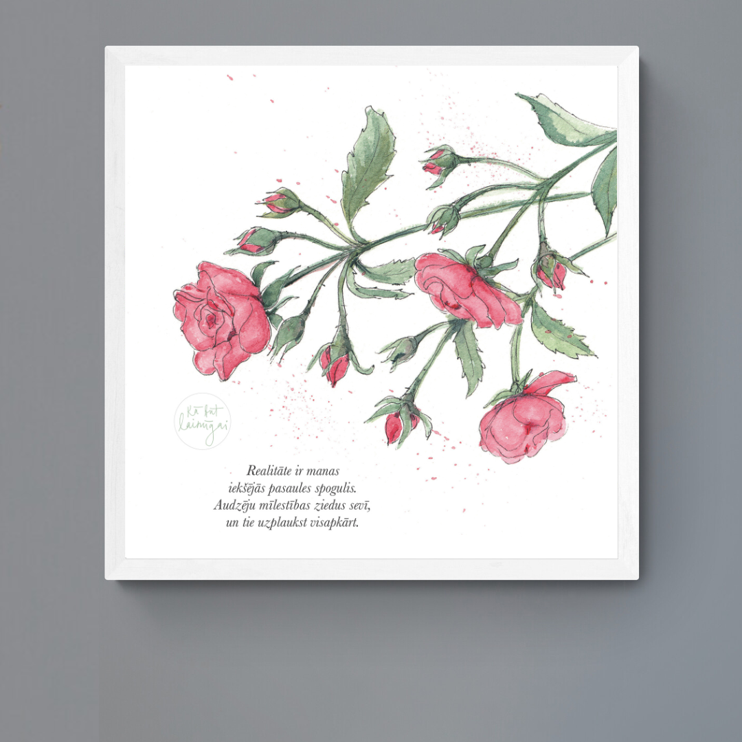 Aigas Kalniņas ilustrācijas reprodukcija ar afirmāciju no "Iedvesmas kalandārs 2025" baltā koka rāmī.